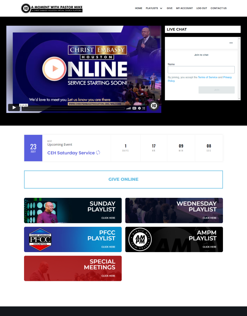 An urgent need arose during the lock down in 2020 to build a custom virtual church where members could go and watch services live or re-watch services they missed.
